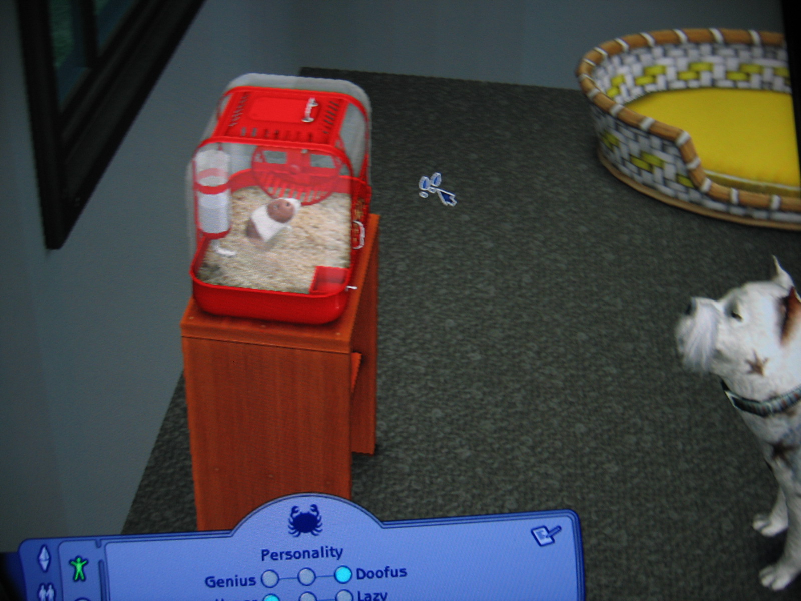 Dogs and cats aren't the only pets in the expansion pack. You can also buy a guinea pig or a bird. There's also a new big aquarium, but that's for mostly display only. Birds can be taught a few tricks, like talking, and guinea pigs can run around and die. Altogether they're not the most interesting of creatures - the guinea pig doesn't even bite anymore, like in the Sims 1. It does however get scared when being barked at by a dog. Like the aquarium fish, a guinea pig also needs some feeding and attention. Thought bubbles show any needs of the hamster.